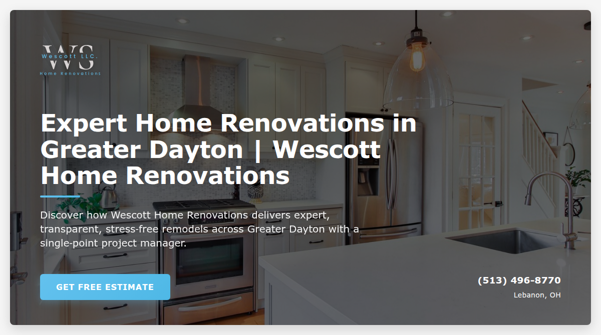 Wescott Home Renovations is a home‑renovation firm serving Lebanon, Ohio. Our services include Kitchen Remodeling; Bathroom Renovation; Custom Cabinetry; Whole‑House Renovations.